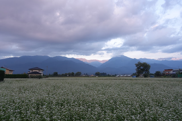 蕎麦の花と、朝焼けのアルプス。長野を抽象化したような景色だな、と思いながら歩く。